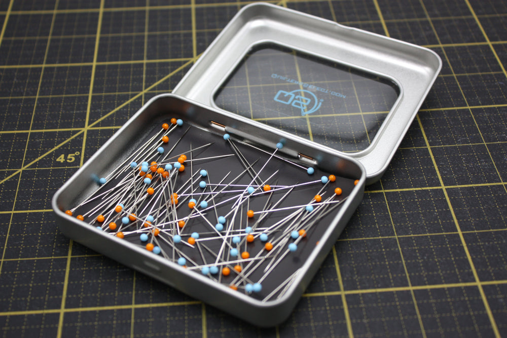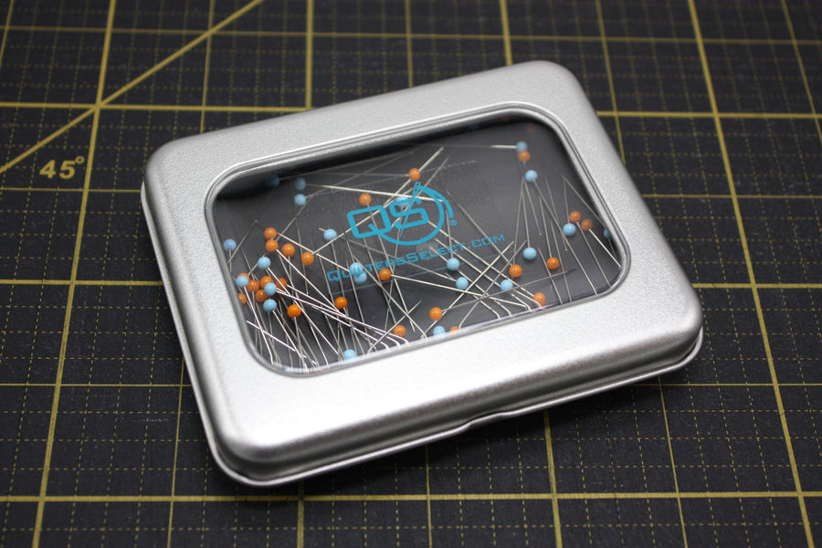 These heat resistant, glass head pins are a staple for any quilter. They come in a handy metal box with a hinged lid. The box has a large magnetic base to ensure the pins stay put. Since they are glass, you can press your project without fear of melting your pins and messing up your iron.